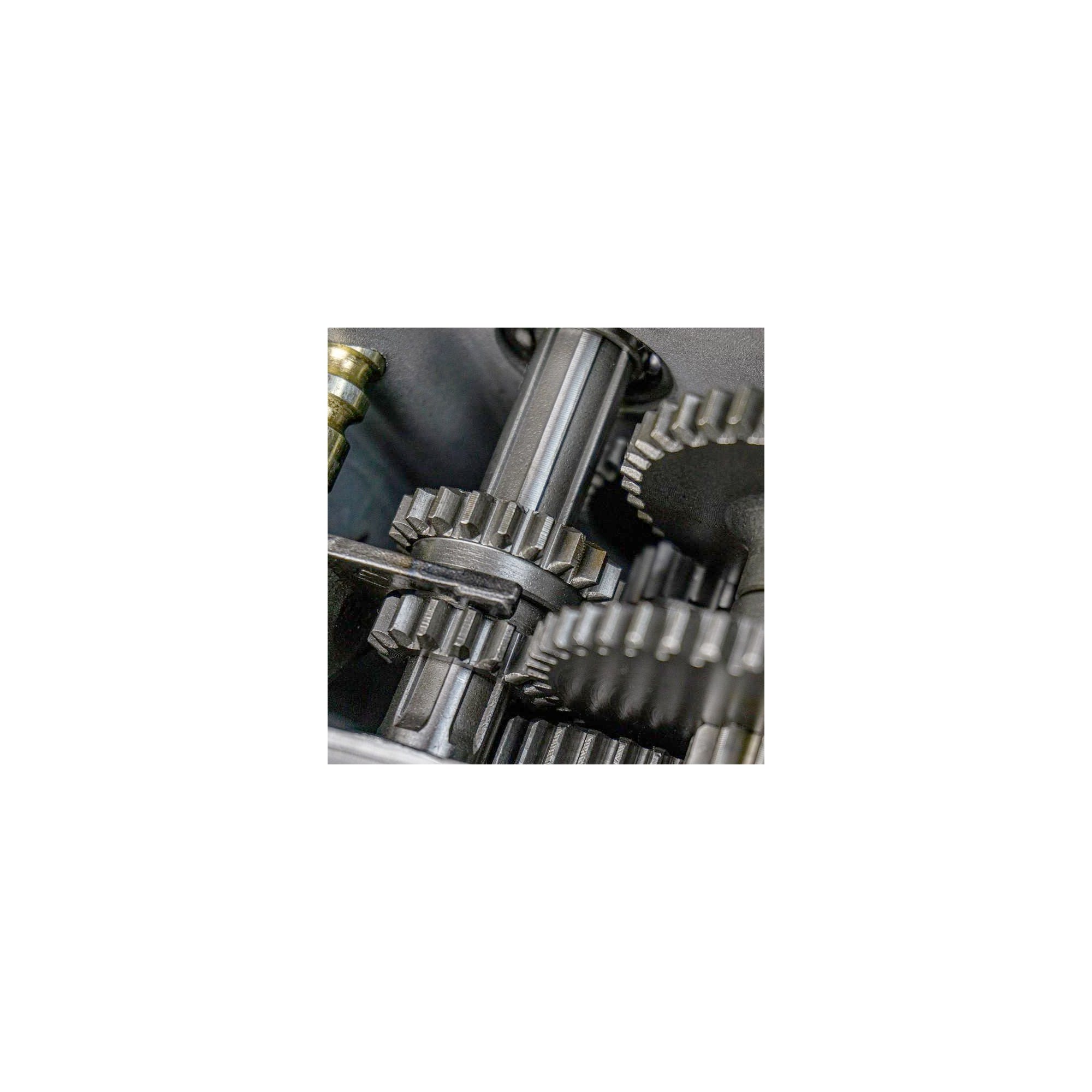 La motoazada Synergy 700 OHV incorpora una robusta caja de cambios con 2 marchas hacia adelante y 1 marcha atrás. En la robusta transmisión encontramos el conjunto de piñonería de alta dureza, también reforzados, en lugar de las cadenas de transmisión que utilizan otras gamas más bajas que tantas averías provocan. En cuanto al eje primario de la transmisión, es hexagonal para aportar todo el par motor a las cuchillas sin perder nada de potencia y, a su vez, no causar daños en el rotavator.
